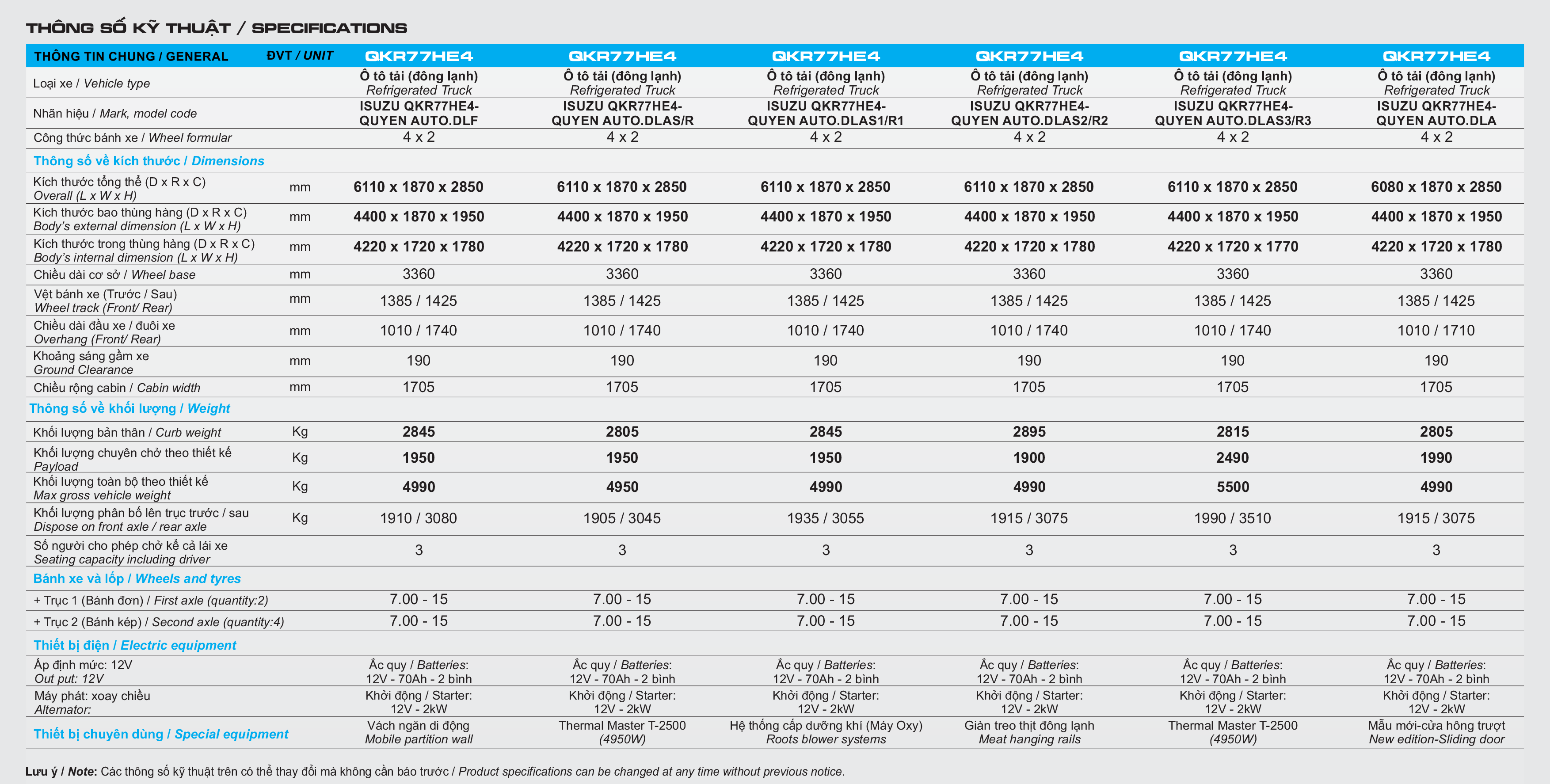 - Kích thước thùng: 4220 x 1720 x 1780 mm Độ lạnh: -18 độ C